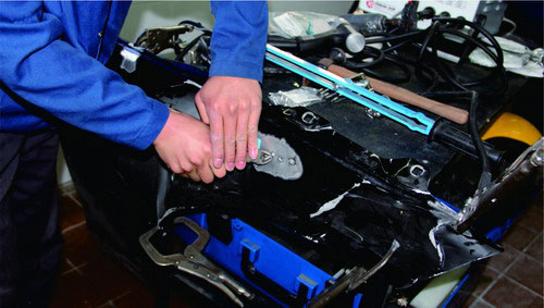 在鋁質(zhì)面板修復(fù)時(shí),也可使用鋁整形機(jī)對損傷部位進(jìn)行拉伸修復(fù),在經(jīng)整形機(jī)修復(fù)到位后,使用專用工具將螺紋介子齊根剪下,再打磨平整即可。對于鋼板車身來說,當(dāng)面板和內(nèi)層結(jié)構(gòu)同時(shí)發(fā)生變形時(shí),可以采取內(nèi)外層分離、分別修整,然后折邊咬合的修復(fù)方法。對于鋁質(zhì)面板,不能使用這種方法,否則由于鋁的韌度較差,折邊部位會(huì)出現(xiàn)裂紋或斷裂。