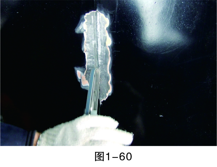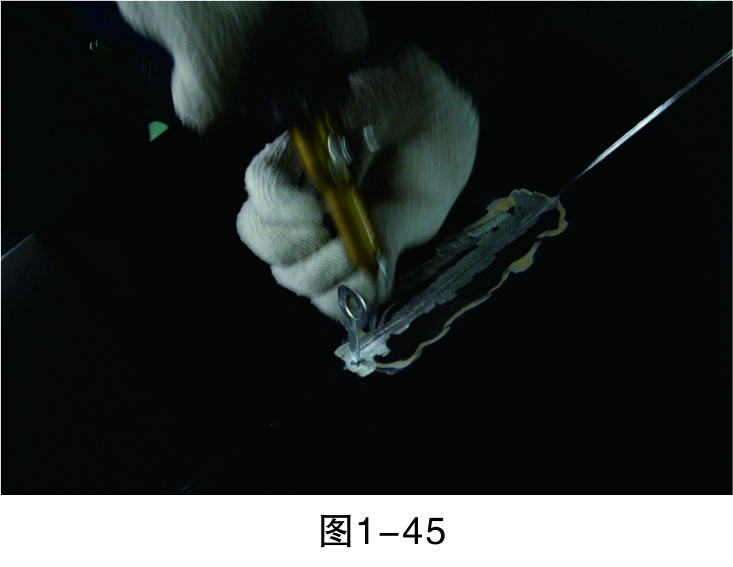 步驟3(除漆):打磨漆層,至板件金屬裸露后進(jìn)行清潔,然后再進(jìn)行鈑金作業(yè),如圖1-44所示。