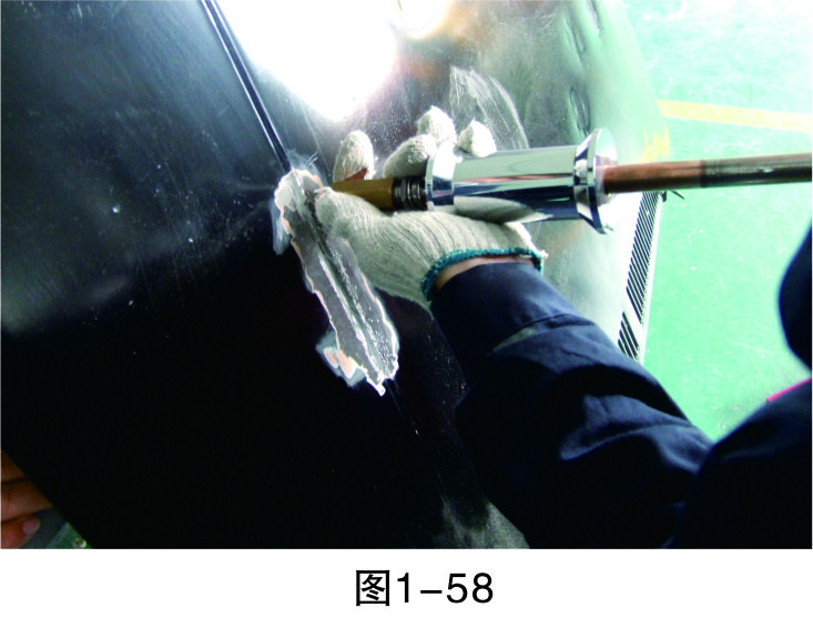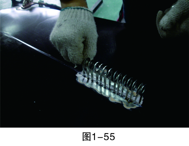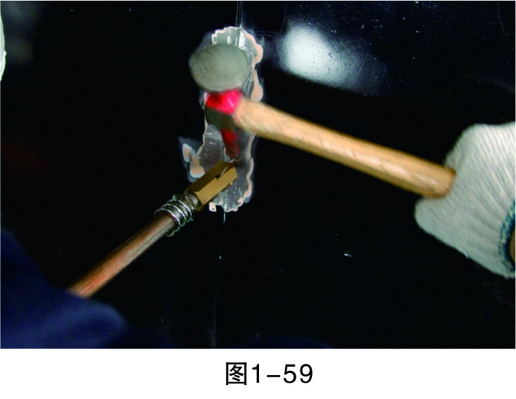 步驟18(拉低打高):對相對低的位置進(jìn)行拉伸,對相對高的位置進(jìn)行敲擊,要注意焊拉槍與鈑金錘的配合,重點(diǎn)是把握好力度,如圖1-59所示。