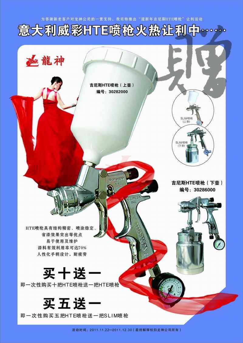 吉尼斯HTE噴槍11月促銷 吉尼斯HTE噴槍2011年11月促銷 (活動已結束,感謝您的關注) 一、主題: 吉尼斯HTE噴槍讓利促銷 二、活動目的: 讓利回饋給力促銷 三、活動時間: 1、 時間:2011年11月21日至2011年12月30日 2、 時長:共計40天 四、活動內容: 1、 買十送一(即一次購買十把HTE噴槍送一把HTE噴槍) 2、 買五送一(即一次購買五把HTE噴槍送一把SLIM噴槍) 市場部 2011年11月17日 宣傳海報 2011-11-19 12932