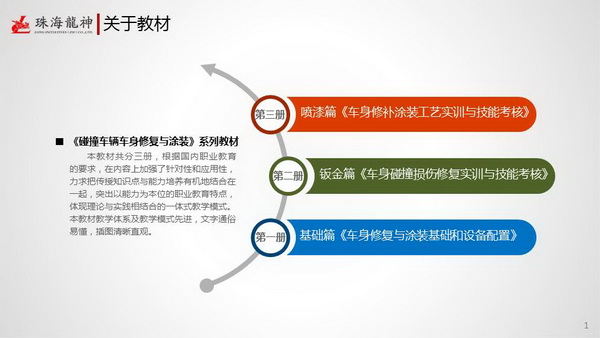 珠海市龍神有限公司2014年隆重巨獻(xiàn)《碰撞車輛車身修復(fù)與涂裝》系列教材:基礎(chǔ)篇《車身修復(fù)與涂裝基礎(chǔ)和設(shè)備配置》、鈑金篇《車身碰撞損傷修復(fù)實(shí)訓(xùn)與技能考核》、噴漆篇《車身修補(bǔ)涂裝工藝實(shí)訓(xùn)與技能考核》。