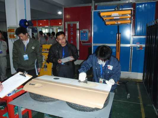 車(chē)身涂裝技能大賽面漆噴涂比賽現(xiàn)場(chǎng) 涂裝大賽現(xiàn)場(chǎng)裁判執(zhí)行班評(píng)分